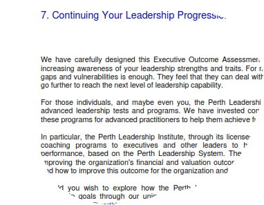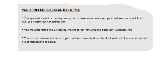After completing the Executive Outcome Assessment, we will provide a comprehensive report on your particular leadership capabilities and potential financial outcomes. Detailed steps for improving your leadership outcome and the outcome of your enterprise will be provided. Extracts of a sample assessment are shown below.
