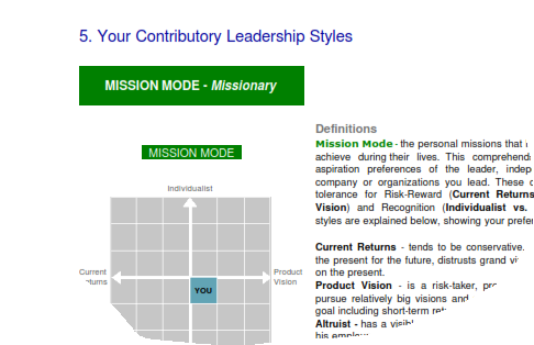 Your Dominant Leadership StyleThis section defines the leadership mode that you are most comfortable with and highlights some of your preferred executive techniques. |